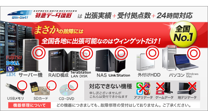 インターネットで調べてみても、業者は大きな都市にしかなく、岡山県内で見つからずいったんは諦めかけたそうですが、Win-Get!は出張データ復旧にも対応していると、一縷の望みをかけてお問い合わせいただけたそうです。Win-get!は全国のお客様のお役に立つため受付窓口があり、また、受付窓口では対応の難しいサーバなどの特殊機器には出張でご対応します。是非一度、ご相談ください!