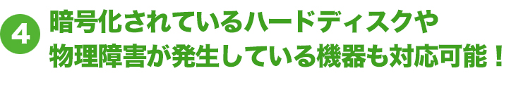 データ復旧専門の会社ですので、セキュリティ強化のために暗号化をかけていたハードディスクや、ハードディスク自体が物理的に故障している重度障害の場合も、データ復旧の対応が可能です。
