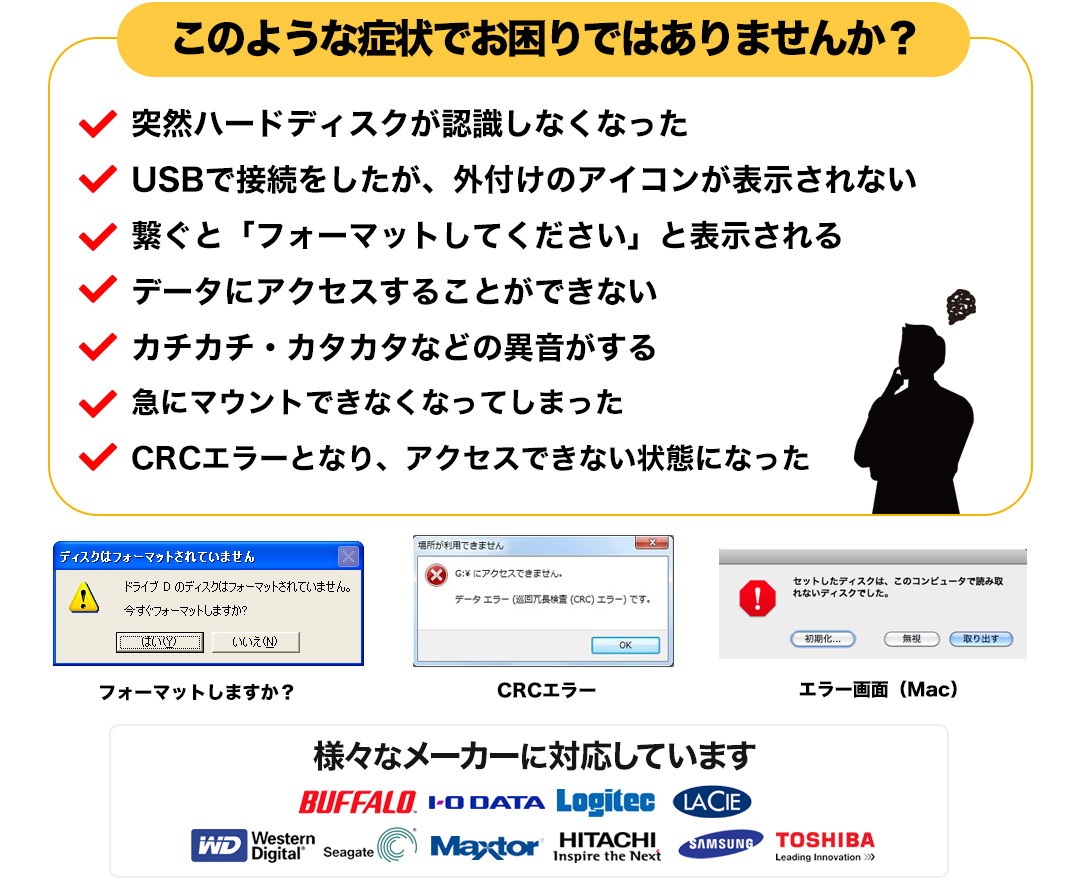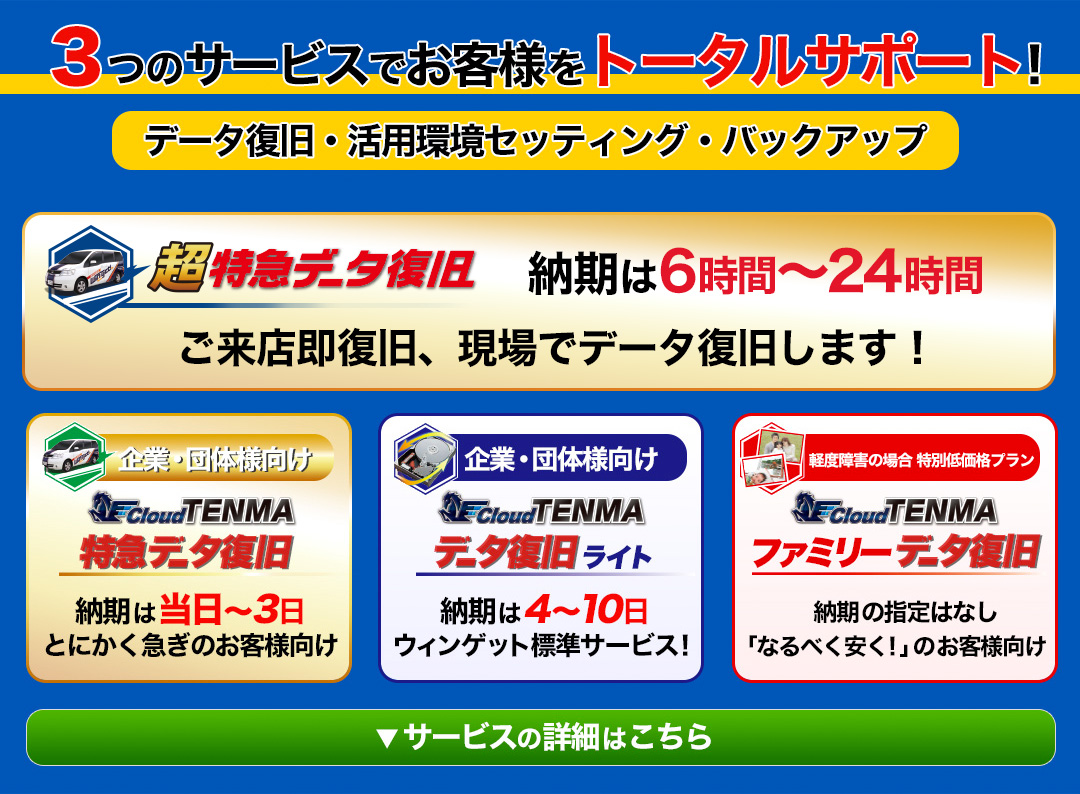 データ復旧専門10 年以上の経験で培った高度な技術と、信頼のサービスでお選びいただいております。出張サービスを業界内でもいち早くスタートさせ、お客様のニーズに合わせたサービスでご満足いただいております。