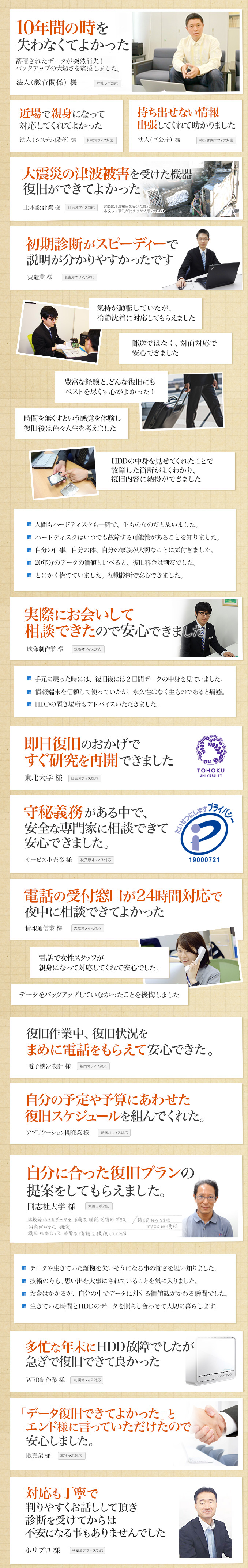 今までに、10,000件を超えるお客様のデータを復旧して参りました。データが戻った瞬間、お客様が本当に安心される場面に、何度もたち合わせていただいております。