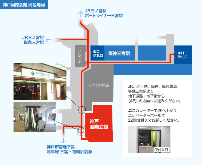 地下街を経由される場合、阪神電車 三宮駅が神戸国際会館に一番近い駅となります。 各線三宮駅から阪神電車方面、地下街【A8】出口を目指して移動してください。