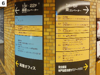 ブルー看板側、高層エレベーターで22階まで上がり、受付までお越し下さい。
