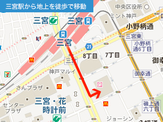 三宮駅から地上を徒歩で移動 地上でお越しの場合、JR三宮駅西口から南へ直進徒歩3分で到着です。
